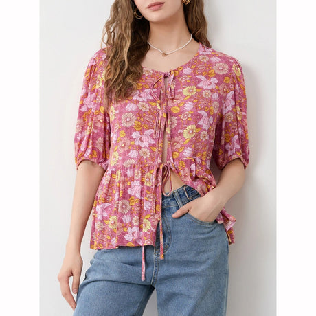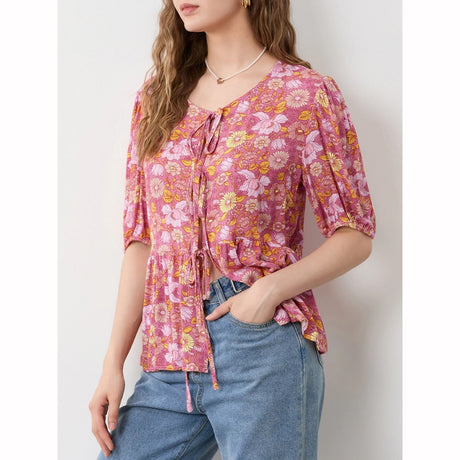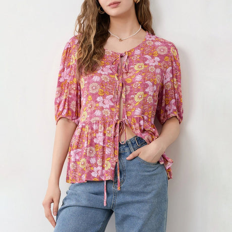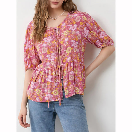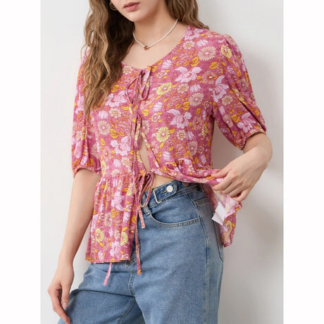 Regular price $71.99 USDUnit price /UnavailableFloral Lace-Up Bow V-Neck Blouse