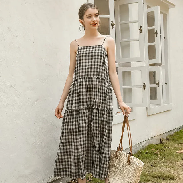 Step into summer with style and grace in our Vintage Plaid Cotton Linen Summer Dress. Crafted from a blend of 90% cotton and 10% linen, this dress exudes both comfort and elegance. With its sleeveless, backless design and a stunning long black silhouette, it’s the perfect ensemble for holiday getaways, beach adventures, or embracing your inner boho spirit. Designed with your comfort in mind, this dress features a loose fit and a breathable fabric that keeps you cool even on the hottest days. Its A-line silhouette flatters every body type, while the mid-calf length adds a touch of sophistication to your look. But what sets our dress apart are the intricate details. The plaid pattern adds a vintage charm, while the spaghetti straps and strapless neckline create a chic and timeless appeal. Whether you’re strolling along the shore or dancing the night away at a summer soirée, this dress will make you feel effortlessly beautiful.Product Features: