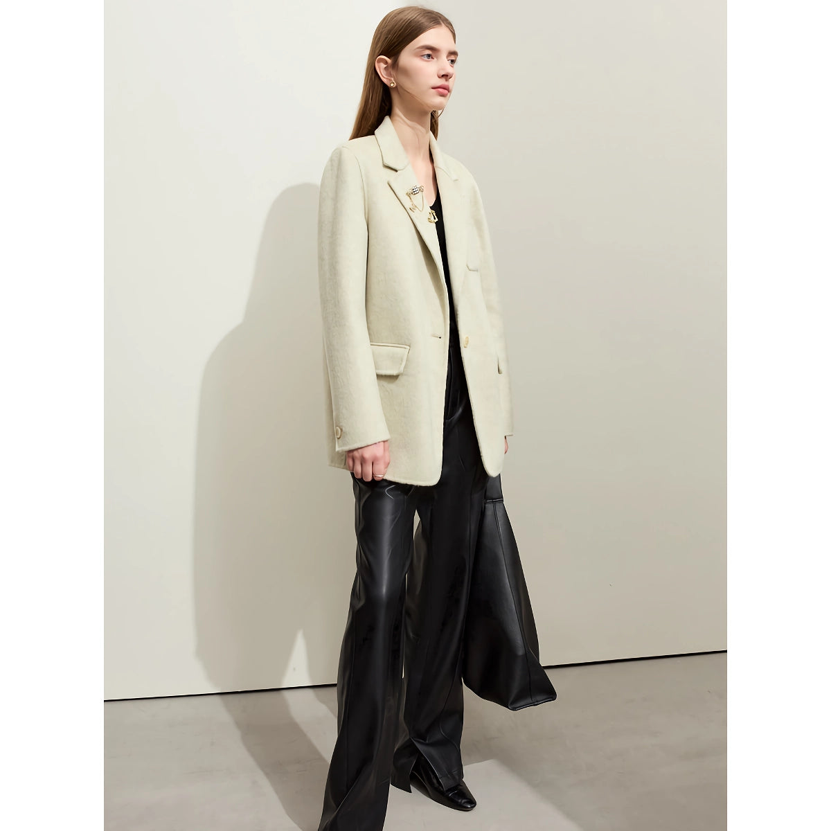 Betreten Sie die kalte Jahreszeit mit Anmut und Eleganz mit unserem minimalistischen doppelseitigen Wollmantel für Damen. Diese lange Winteroberbekleidung wurde für die moderne Bürodame entworfen und verbindet zeitlose Eleganz mit zeitgenössischem Stil. Dieser Mantel aus einer luxuriösen Mischung aus Wolle, Seide und Kamelwolle ist Ihr perfekter Begleiter für die kühlen Tage und bietet Wärme ohne Kompromisse beim Stil.Produkteigenschaften
