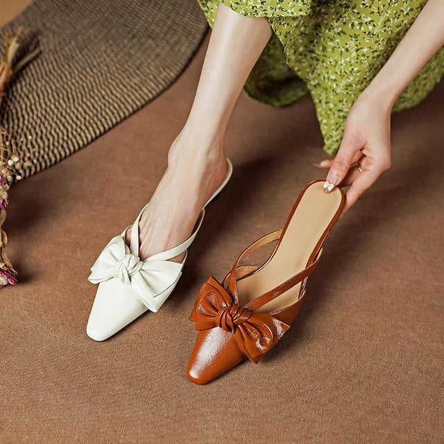 Diese Pantoletten aus echtem Rindsleder sind ebenso strapazierfähig wie stilvoll. Das dünne Fersendesign sorgt für einen eleganten Auftrieb und gewährleistet Stabilität bei jedem Schritt. Mit einem bezaubernden Schmetterlingsknoten auf der Vorderseite verleihen diese Schuhe Ihrem Ensemble ein verspieltes und doch raffiniertes Element. Das solide Muster und die elegante spitze Zehenpartie verstärken ihren klassischen Reiz und machen sie zu einer zeitlosen Ergänzung für jede Garderobe.Vorteile