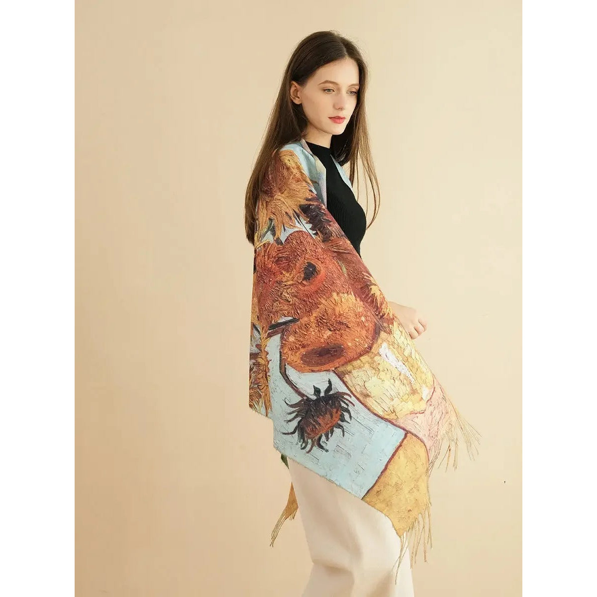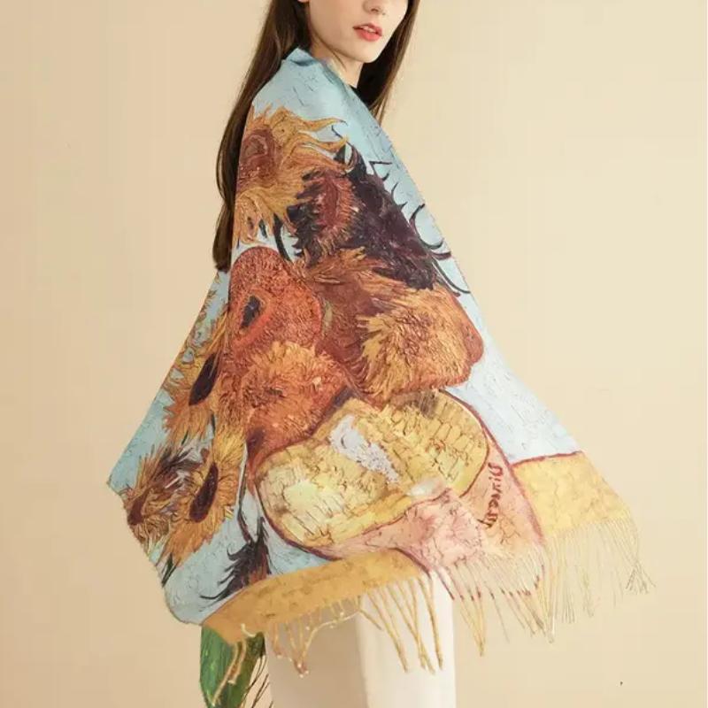Erleben Sie die Kombination aus Kunst und Komfort mit diesem atemberaubenden Kaschmirschal mit Sonnenblumen-Print. Inspiriert von dem ikonischen Gemälde von Van Gogh kombiniert dieser luxuriöse Pashmina-Schal die reichhaltige Textur von Kaschmir mit hochauflösendem Digitaldruck, um das lebendige Sonnenblumen-Design zum Leben zu erwecken. Egal, ob Sie Ihrer Wintergarderobe einen Hauch von Eleganz verleihen oder das perfekte Geschenk für eine besondere Person suchen, dieser Schal bietet sowohl Stil als auch Wärme.