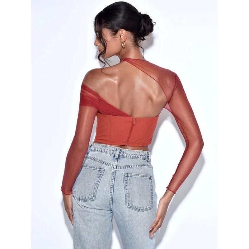 Trägerloses, rückenfreies, sexy bauchfreies Top mit transparenten Netzärmeln