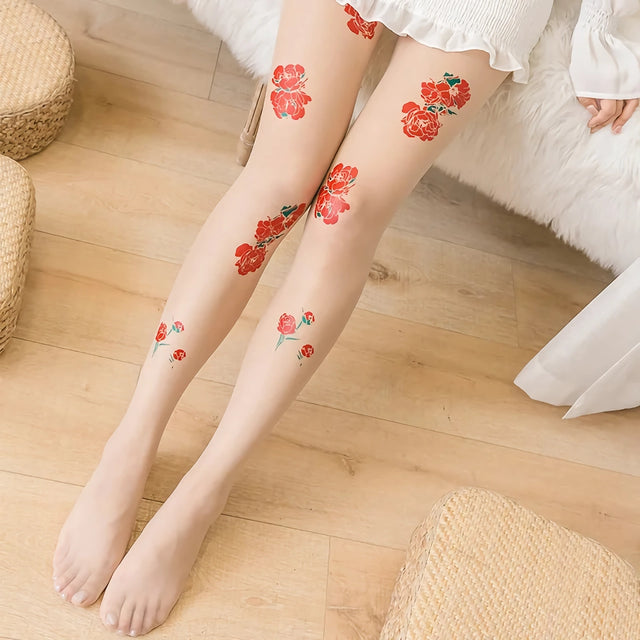 Transparente Nylonstrumpfhose mit Blumenmuster und roten Rosen – Sexy dünne Strumpfhose mit Haken- und Ösenschutz für Damen