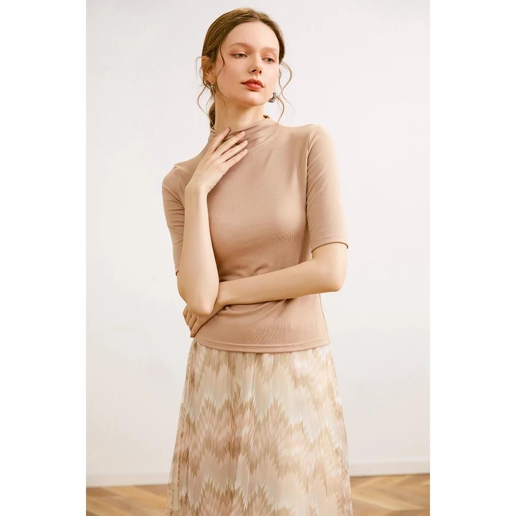 Wir präsentieren unser T-Shirt aus Wollmischung mit Rollkragen für Damen, eine perfekte Mischung aus Eleganz und Komfort. Dieses T-Shirt wurde entworfen, um Ihre Garderobe aufzuwerten. Es ist ein vielseitiges Stück, das jeden Stil ergänzt, von lässig bis elegant. Egal, ob Sie ins Büro gehen oder einen Wochenendausflug genießen, mit diesem Oberteil bleiben Sie den ganzen Tag über stilvoll und bequem.