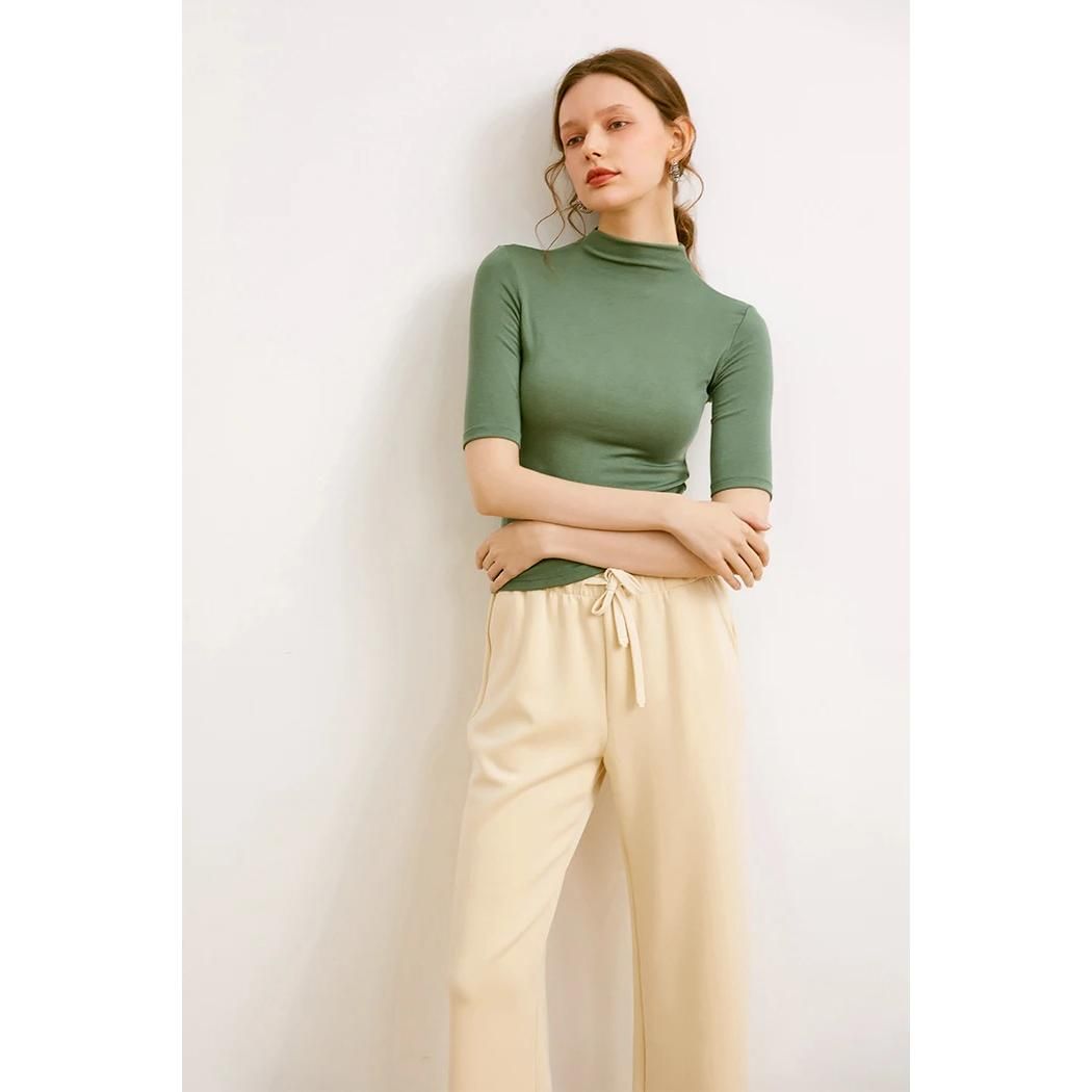 Unser Rollkragen-T-Shirt aus Wollmischung für Damen besticht durch seine hervorragende Qualität und sein minimalistisches Design. Die Mischung aus Wolle, Elasthan, Acryl und Viskose bietet eine unübertroffene Kombination aus Wärme, Elastizität und Haltbarkeit. Dieses T-Shirt ist nicht nur ein Kleidungsstück; es ist eine Investition in Ihre Garderobe, die Stil und Komfort für die kommenden Saisons verspricht.