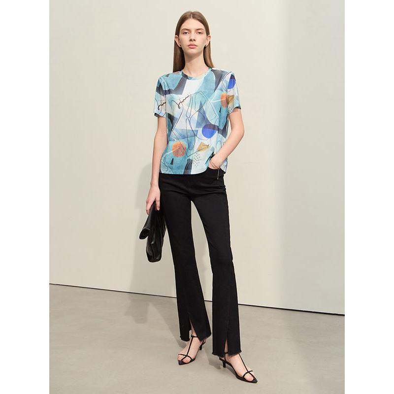 Unser T-Shirt ist so durchdacht, dass Sie gut aussehen und sich auch so fühlen. Es besteht aus einem weichen Netzgewebe, das sowohl atmungsaktiv als auch dehnbar ist und sich dank seiner hohen Dehnbarkeit an alle Körpertypen anpasst. Das einzigartige geometrische Muster verleiht einen Hauch künstlerischen Flairs, während die Patchwork-Verzierung das Gesamtdesign aufwertet und jedes Stück zu einem Kunstwerk macht.