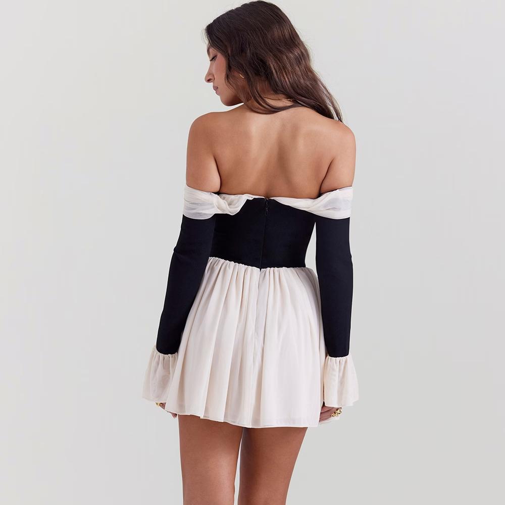 Das elegante trägerlose, rückenfreie Minikleid besticht durch seine einzigartige Kombination aus trägerlosem Ausschnitt, rückenfreiem Design und langen ausgestellten Ärmeln. Das Patchwork-Muster verleiht einen Hauch moderner Eleganz, während die Etui-Silhouette für eine schmeichelhafte Passform sorgt. Dieses Kleid ist so konzipiert, dass es Ihre Kurven betont und Ihre besten Eigenschaften hervorhebt, sodass Sie sich selbstbewusst und sexy fühlen. Egal, ob Sie auf der Tanzfläche sind oder eine stilvolle Veranstaltung besuchen, dieses Kleid ist Ihre erste Wahl, um ein Statement abzugeben.