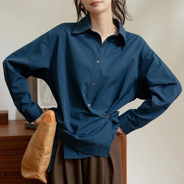 Werten Sie Ihre Alltagsgarderobe mit diesem stilvollen und vielseitigen Langarmhemd auf, das für Frauen entworfen wurde, die Komfort und moderne Eleganz schätzen. Diese locker sitzende Bluse ist perfekt für das Büro oder einen lässigen Tag in der Stadt und kombiniert mühelose Mode mit Funktionalität. Der unregelmäßige, asymmetrische Saum verleiht dem klassischen Hemd eine einzigartige Note und verleiht ihm einen raffinierten und doch entspannten Look. Dieses Hemd wurde für die Herbst- und Wintersaison entworfen und ist Ihr neuer Favorit für Lagen- und Übergangsoutfits.