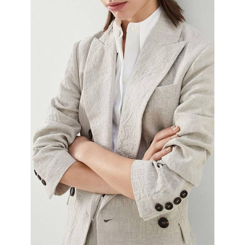 Elegantes, mit Perlen besetztes Leinenanzug-Set – Zweireihiger Blazer und gerade geschnittene Hose für Damen