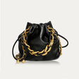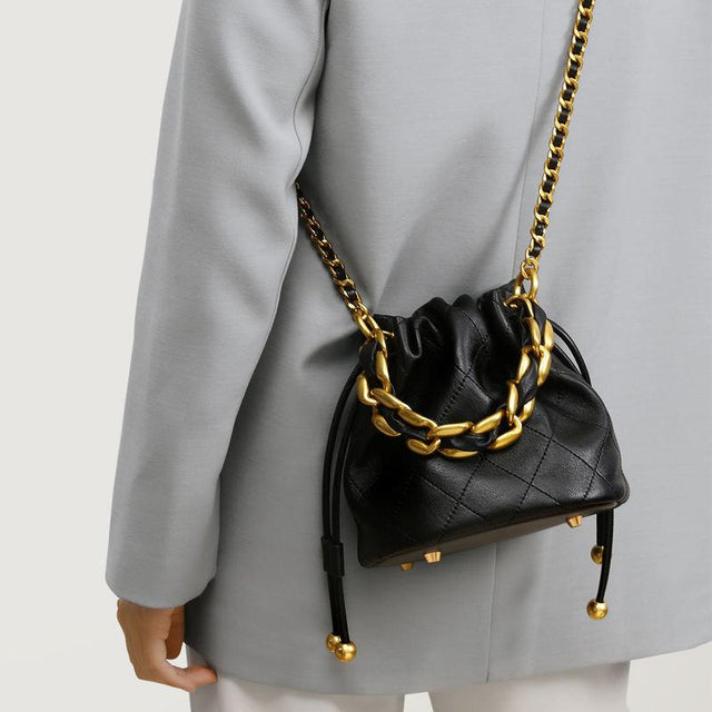 Gesteppte Beuteltasche aus echtem Leder mit Kordelzug – Umhängetasche mit Kettenriemen für Damen