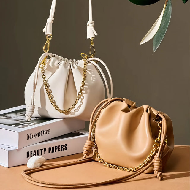 Diese Wolkentasche ist nicht nur ein modisches Statement, sondern ein vielseitiges Accessoire, das Ihrer Garderobe einen Hauch von Luxus verleiht. Sie ist aus hochwertigem Rindsleder gefertigt und robust genug, um dem täglichen Gebrauch standzuhalten, während Sie mühelos stilvoll aussehen. Die trendige, plissierte Eimerform verleiht der Tasche eine weiche, wolkenähnliche Silhouette, die sowohl auffällig als auch praktisch ist. Egal, ob Sie sich für einen formellen Anlass schick machen oder es leger angehen, diese Handtasche ist Ihr perfekter Begleiter. Ihr leichtes Design sorgt für Komfort, während der Kettenriemen Flexibilität für verschiedene Looks bietet.