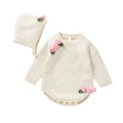 Langärmliger Strick-Bodysuit für Neugeborene mit 3D-Blumenmütze für Mädchen – 2-teiliges Outfit-Set