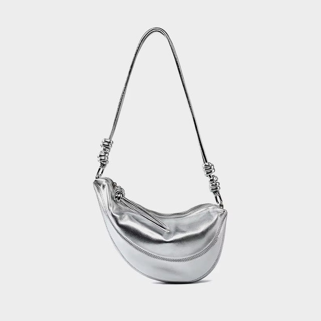 Diese stilvolle silberne Umhängetasche ist perfekt für jeden Anlass. Ihr schlankes Design macht sie zum idealen Begleiter für Partys, elegante Abendessen oder sogar Tagesausflüge, bei denen Sie Ihrem Outfit einen Hauch von Luxus verleihen möchten. Die Vielseitigkeit der Knödelform in Kombination mit dem glänzenden Metallic-Finish ergibt eine Tasche, die sich problemlos von schickem Tageslook zu glamourösem Abendlook verwandeln lässt.Vervollständigen Sie Ihren Look mit Luxus