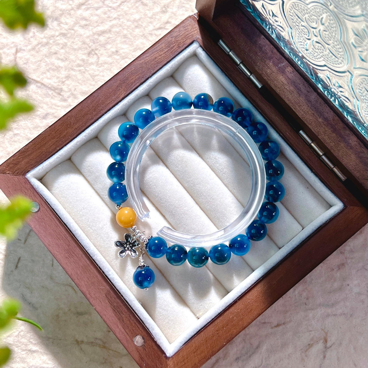 Blaues Zuckerherz-Achat-Armband mit kleinem Blumenanhänger