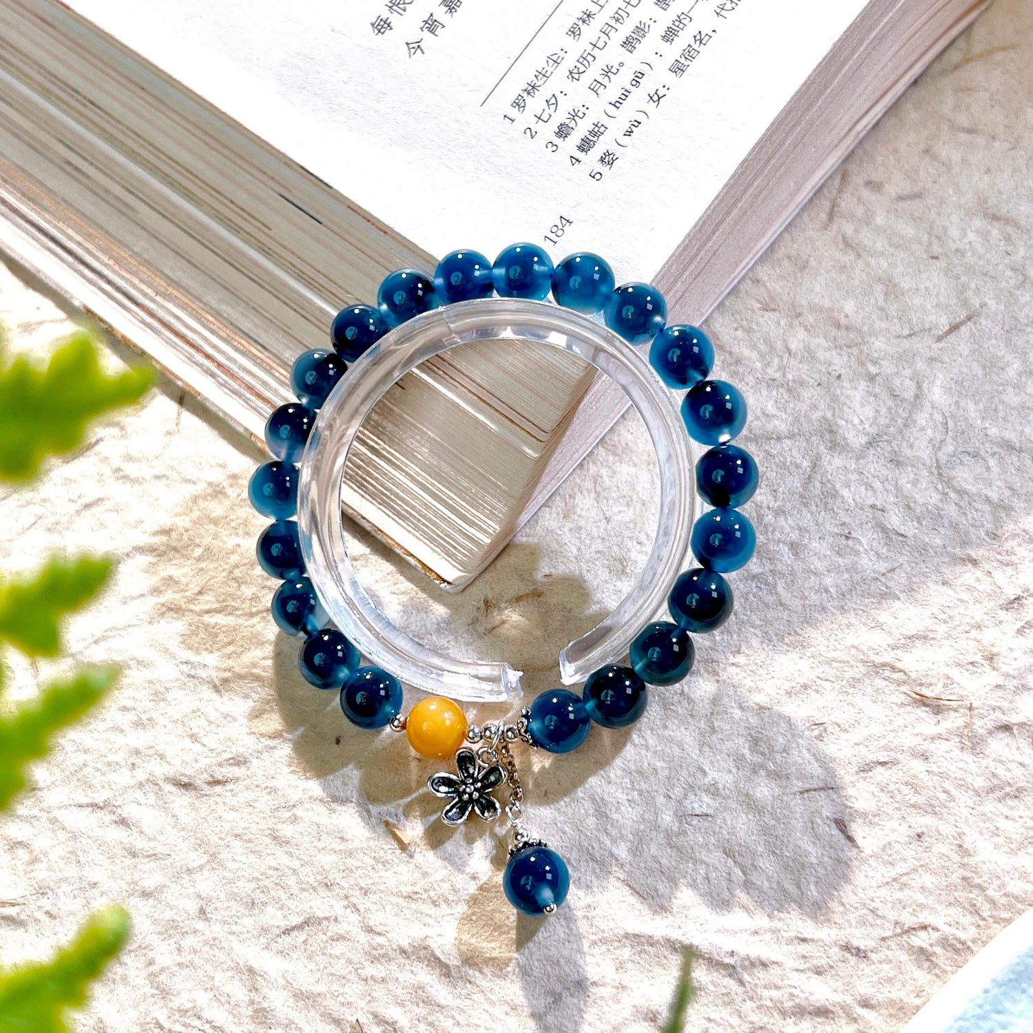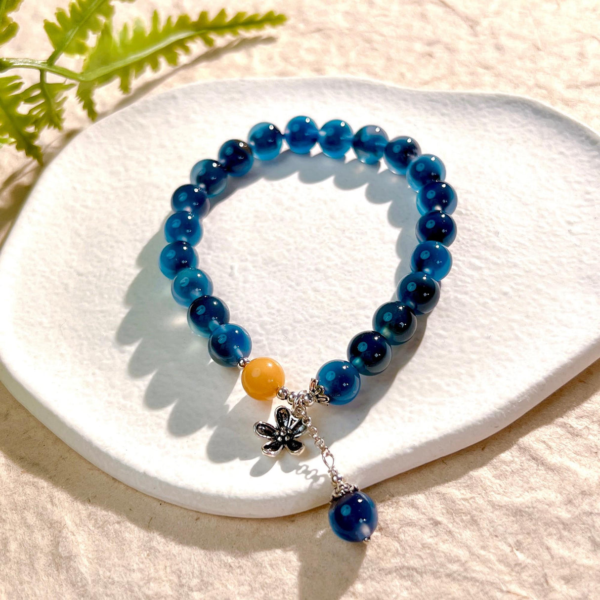 Blaues Zuckerherz-Achat-Armband mit kleinem Blumenanhänger - Blau ist auf Lager und wird versandt, sobald es wieder verfügbar ist