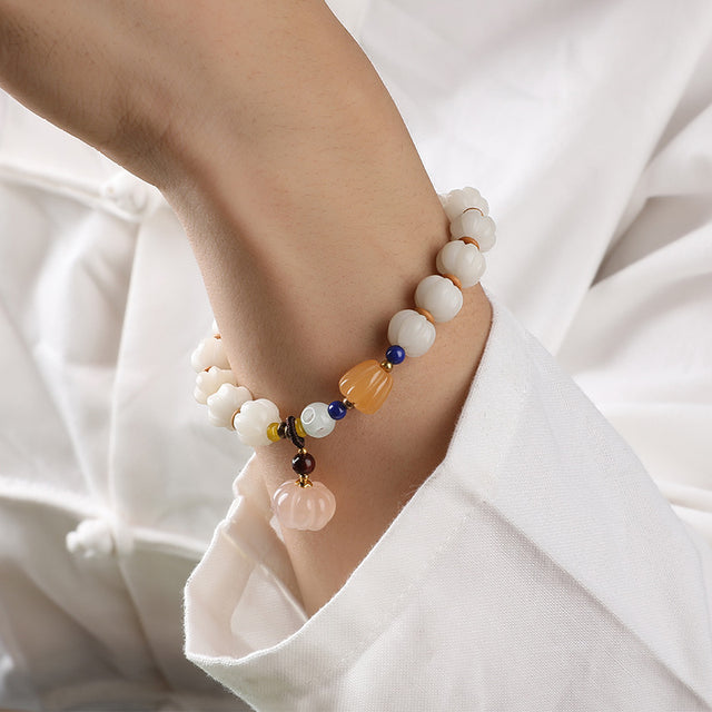 Weißes Bodhi-Wurzel-Armband mit geschnitzten Kürbisperlen, Jade, Lotus und Wenju