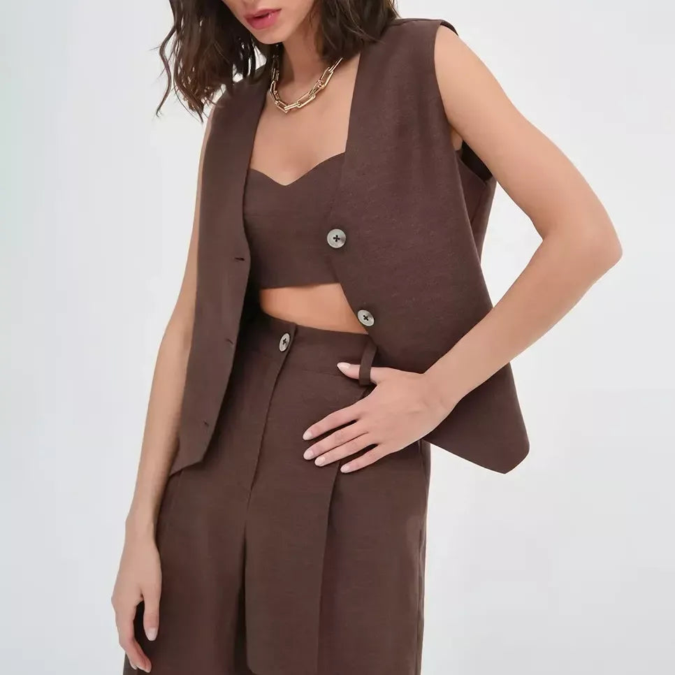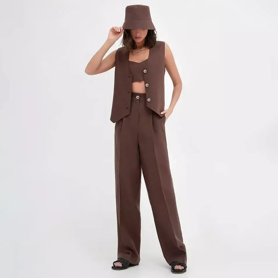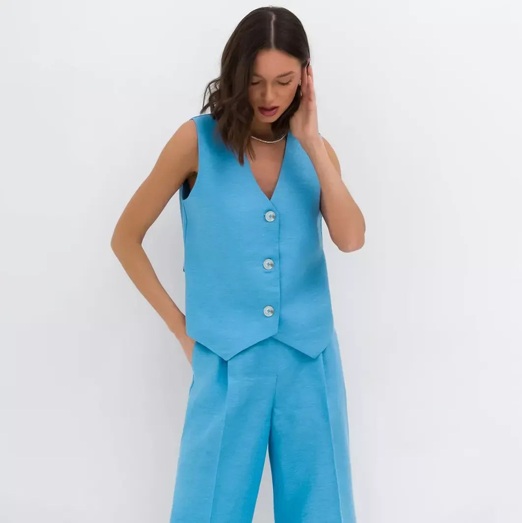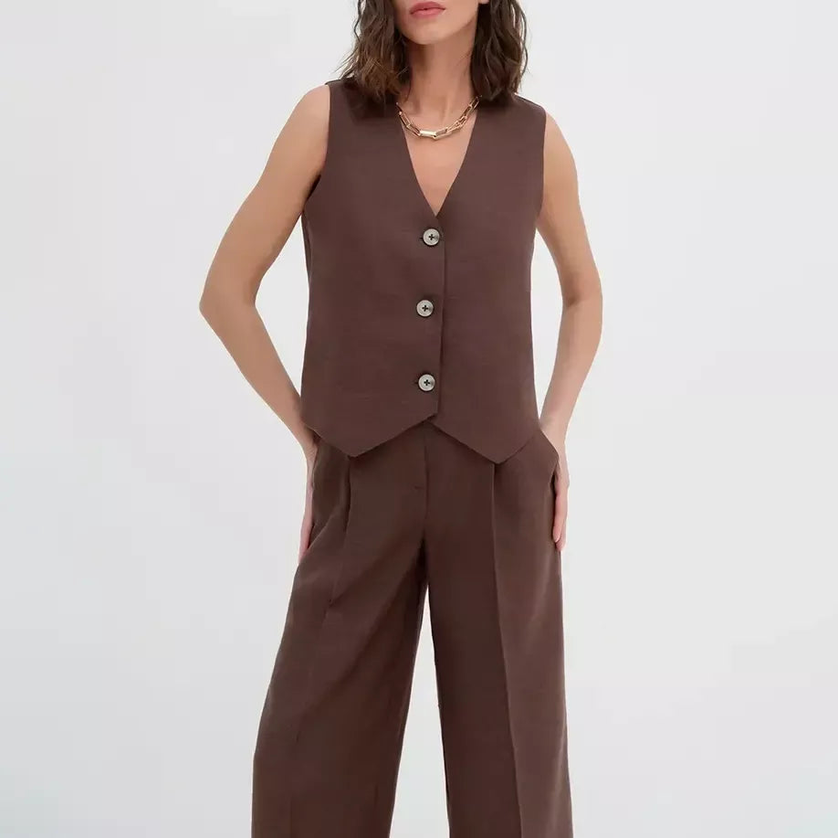 Genießen Sie Eleganz und Komfort mit unserem schicken Set aus ärmelloser Weste und Hose mit weitem Bein aus Baumwoll-Leinen-Mischgewebe. Dieses Ensemble ist maßgeschneidert für die moderne Frau, die Stil ebenso schätzt wie Komfort, und ist Ihr Ticket für anspruchsvolle Schlichtheit. Dieses zweiteilige Set ist ideal für verschiedene Anlässe, vom entspannten Brunch bis zum professionellen Rahmen. Sie können damit Eindruck machen und sich dabei rundum wohlfühlen.
