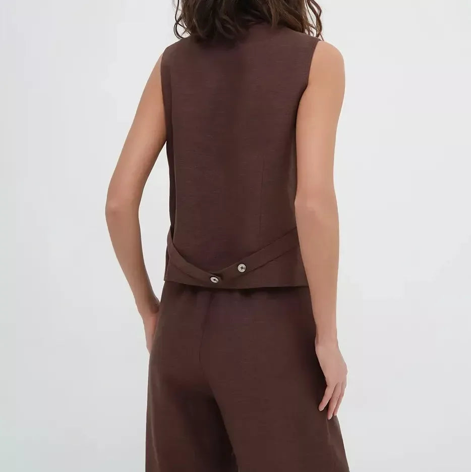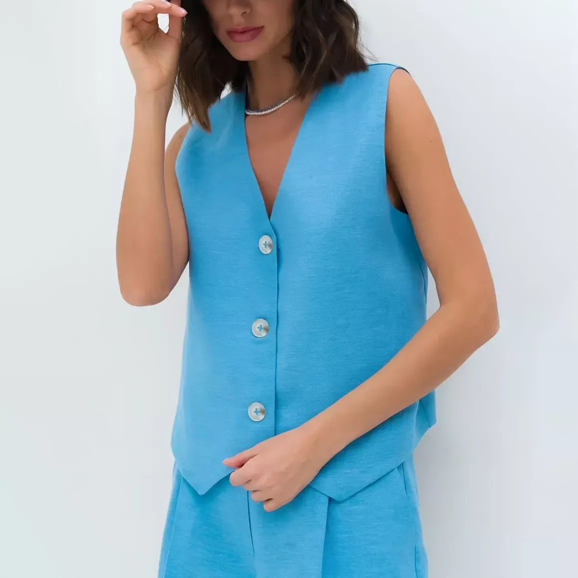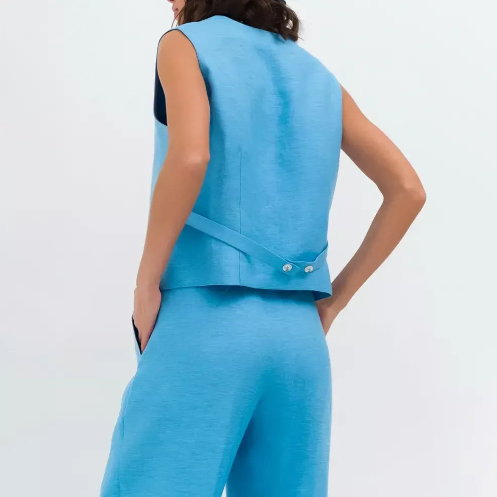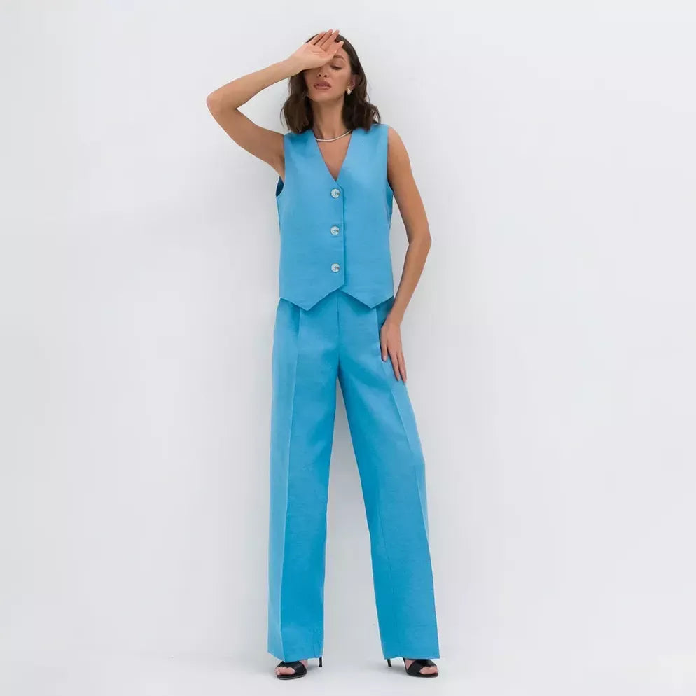Genießen Sie Eleganz und Komfort mit unserem schicken Set aus ärmelloser Weste und Hose mit weitem Bein aus Baumwoll-Leinen-Mischgewebe. Dieses Ensemble ist maßgeschneidert für die moderne Frau, die Stil ebenso schätzt wie Komfort, und ist Ihr Ticket für anspruchsvolle Schlichtheit. Dieses zweiteilige Set ist ideal für verschiedene Anlässe, vom entspannten Brunch bis zum professionellen Rahmen. Sie können damit Eindruck machen und sich dabei rundum wohlfühlen.