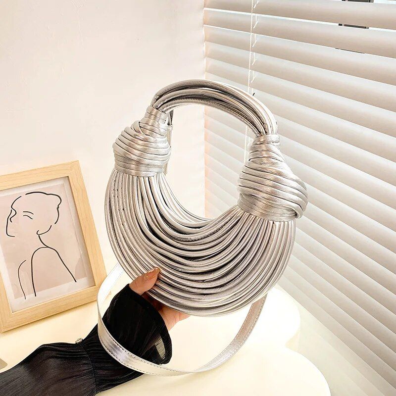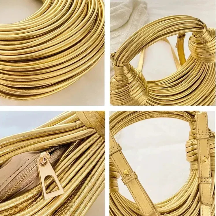 Wir präsentieren den Inbegriff von Raffinesse und Stil – unsere Golden Noodle Knot Abend-Clutch. Diese luxuriöse Designer-Handtasche ist nicht nur ein Accessoire; sie ist ein Statement-Stück, das Ihren Abendlook auf ein neues Glamour-Niveau hebt. Mit ihrem einzigartigen goldenen Nudelknoten-Design verbindet diese Dinnerparty-Clutch nahtlos modernen Chic mit zeitloser Eleganz und sorgt dafür, dass Sie bei jeder Veranstaltung im Mittelpunkt der Aufmerksamkeit stehen.Exquisite Handwerkskunst und Qualität