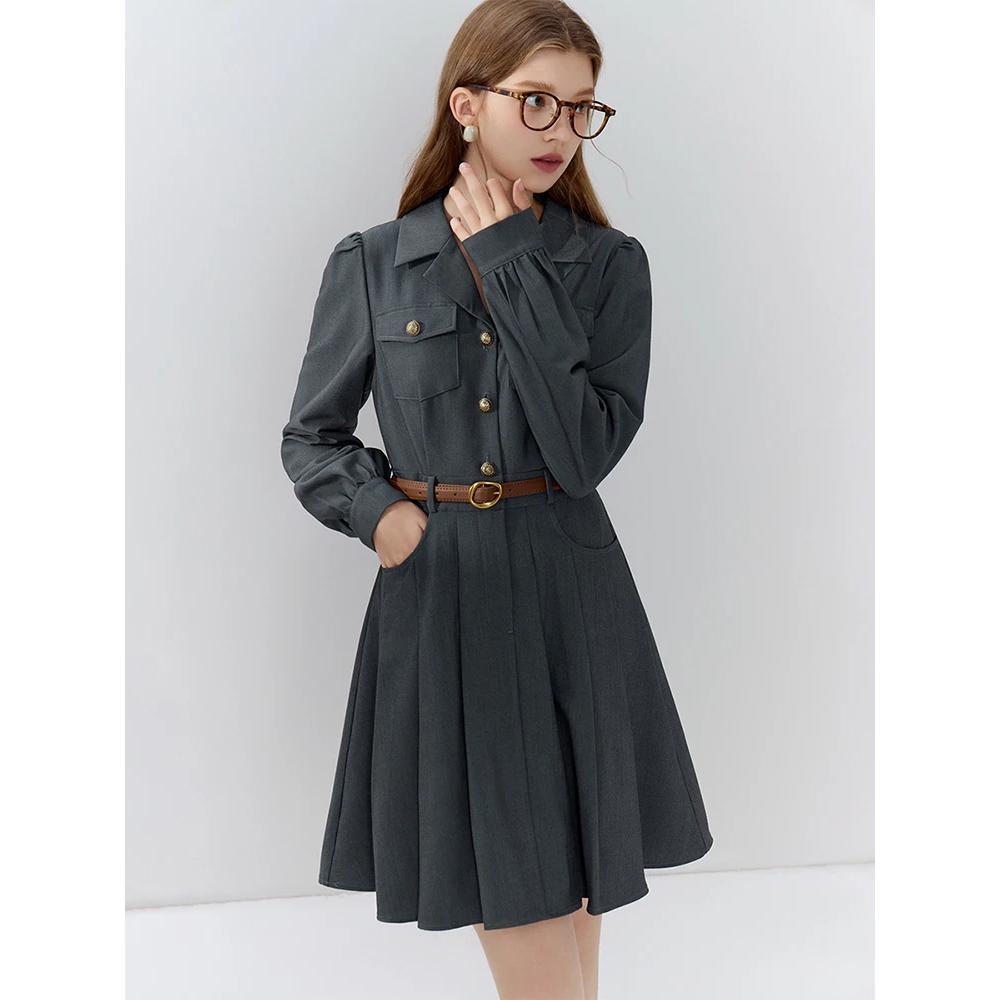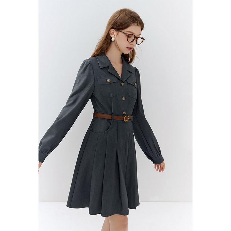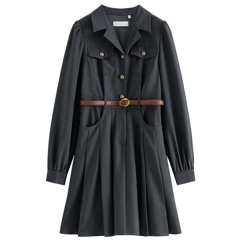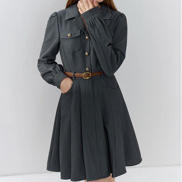 Werten Sie Ihre Bürogarderobe mit dem eleganten grauen Büro-Anzugkleid mit Gürtel auf, einer perfekten Mischung aus Raffinesse und modernem Stil. Dieses für die moderne Frau entworfene Kleid ist ideal für Herbst und Winter und bietet sowohl Komfort als auch Eleganz. Seine maßgeschneiderte Passform und der schicke Gürtel betonen Ihre Taille und sorgen für eine schmeichelhafte Silhouette, die Selbstvertrauen und Professionalität ausstrahlt.