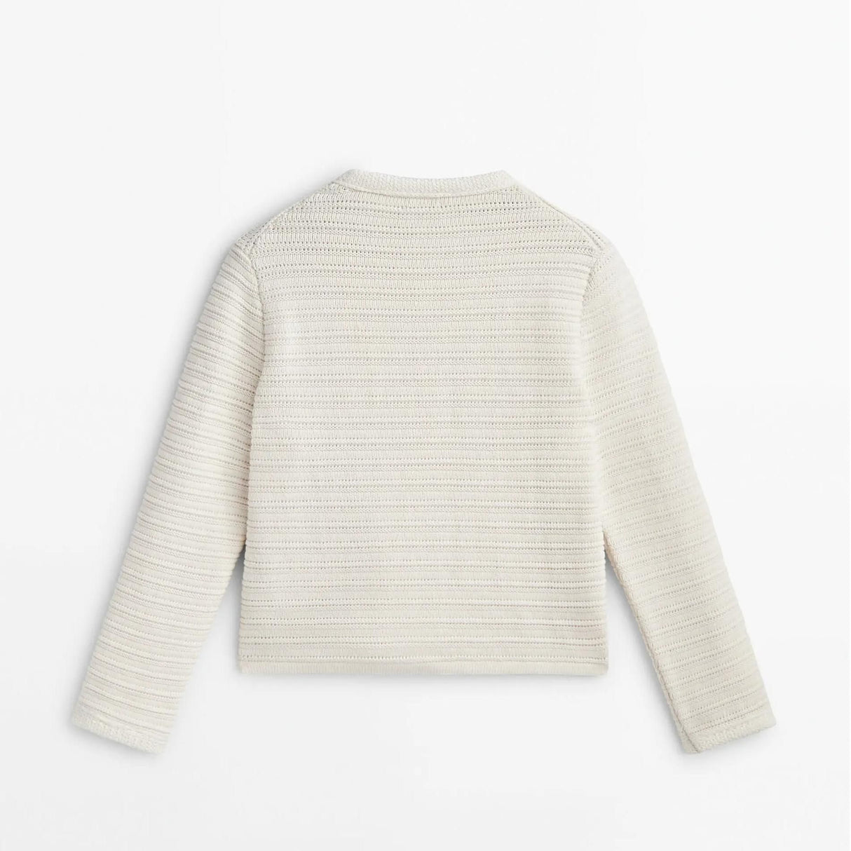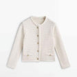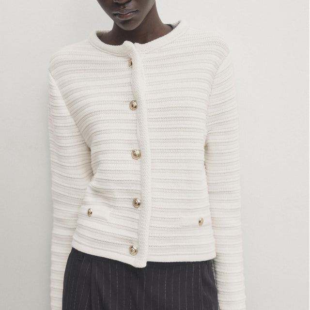 Bleiben Sie stilvoll und gemütlich mit unserem Damen-Strickmantel mit goldenen Knöpfen und Streifen