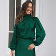Treten Sie in die Welt der Raffinesse ein mit unserem atemberaubenden langärmeligen Herbstkleid aus Satin für Damen, das Ihre einzigartige Eleganz und Ihren Charme zur Geltung bringt. Dieses Kleid ist perfekt für Abendveranstaltungen, formelle Partys oder einen besonderen Anlass im Büro und verfügt über eine elegante, schmale Passform, die Ihre Silhouette ergänzt. Die einfarbige Farbe und die gerüschten Details verleihen einen Hauch von Raffinesse, während die Laternenärmel eine weiche, feminine Note verleihen. Der Neckholder-Ausschnitt strahlt Anmut aus und macht dieses Kleid zu einer perfekten Wahl für Frauen, die eine Mischung aus modernem Stil und klassischem Charme zu schätzen wissen. Dieses Kleid aus hochwertigem Polyestergewebe hat eine weiche Satinoberfläche, die sich luxuriös auf der Haut anfühlt. Mit seiner nicht dehnbaren Passform und der Bleistiftsilhouette betont es Ihre natürlichen Kurven und schafft eine schmeichelhafte und raffinierte Form. Dieses Kleid ist als vielseitiges Herbst-Basic konzipiert und lässt sich mühelos vom Büro zur Abendparty tragen und bietet sowohl Stil als auch Komfort.
