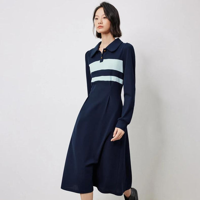 Gestreiftes Freizeitkleid mit Polokragen für Damen im Herbst - L / Marineblau ist auf Lager und wird versandt, sobald es wieder verfügbar ist