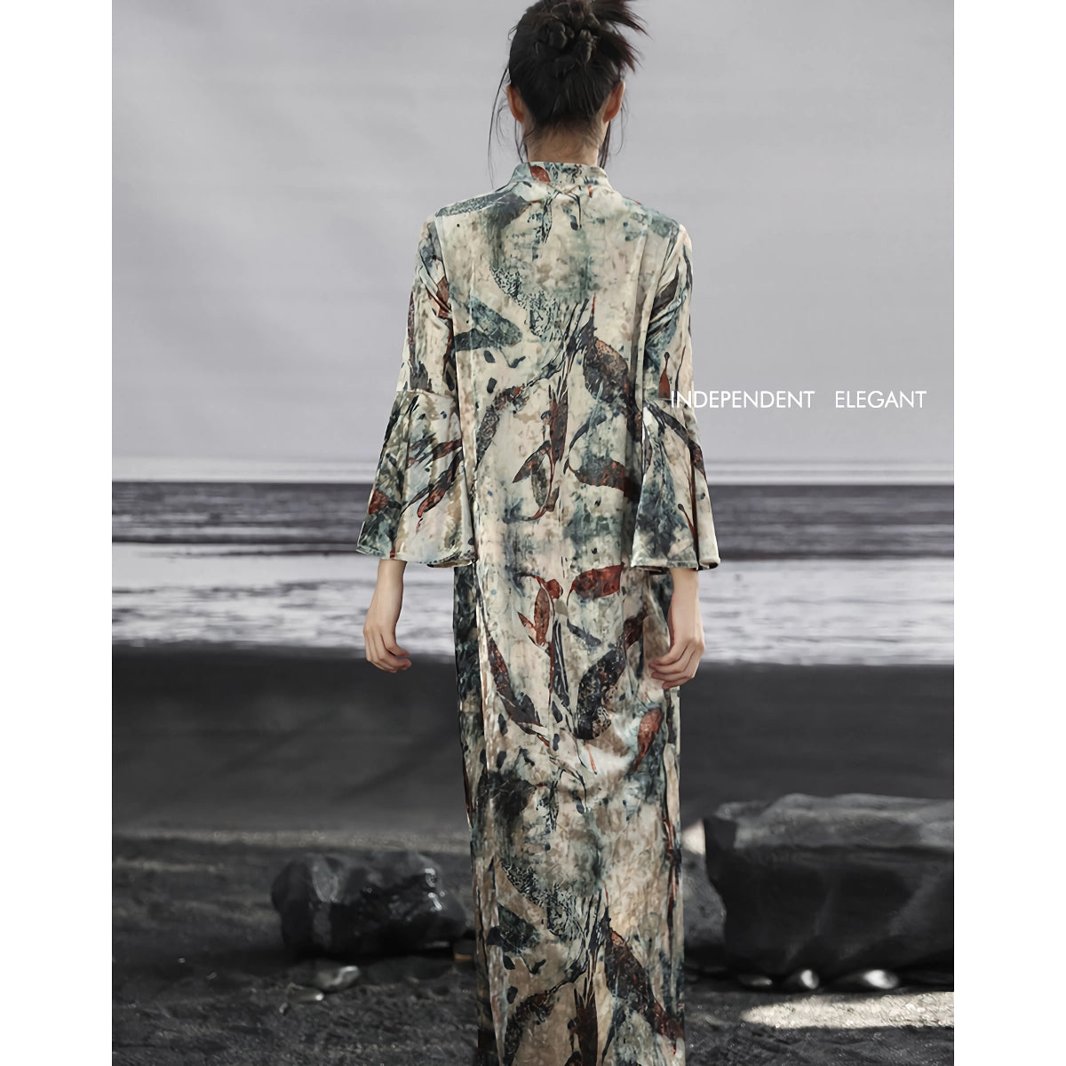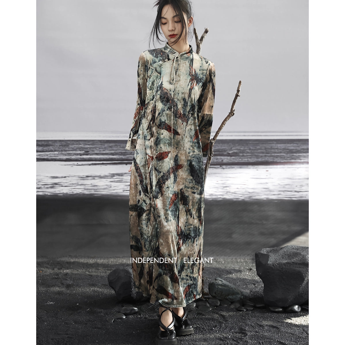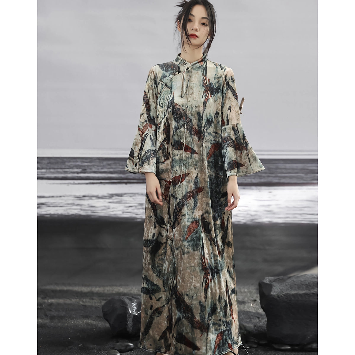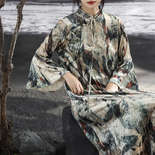 Betreten Sie mit unserem dunklen Samtkleid eine Welt zeitloser Eleganz. Dieses Kleid wurde entworfen, damit Sie sich mühelos kultiviert und stilvoll fühlen. Dieses lange Kleid mit seinem exquisiten, imitierten Flockdruck verbindet klassischen chinesischen Stil mit modernem Modebewusstsein. Die lockere Passform und die weiche Polyester-Seidenmischung sorgen dafür, dass Sie sich wohl fühlen und gleichzeitig Anmut und Ausgeglichenheit ausstrahlen.Hauptmerkmale
