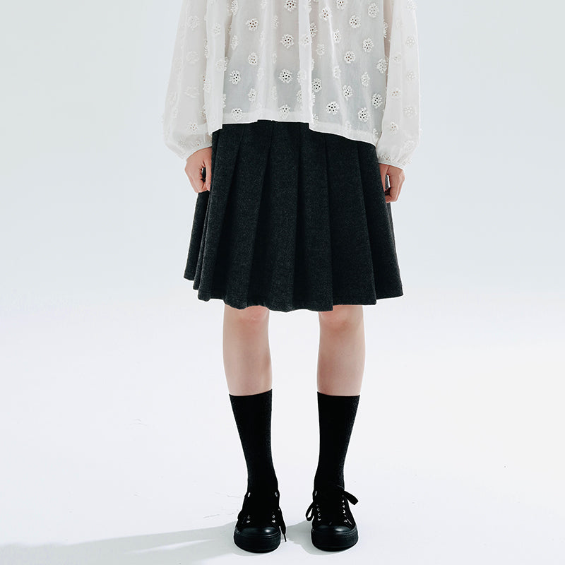 Der Plissee-Wollrock mit elastischer Taille besticht durch seine eleganten Falten und die bequeme Passform. Die natürliche Taille und die A-Linien-Silhouette schmeicheln vielen Körpertypen und machen ihn zu einem vielseitigen Kleidungsstück für jede Garderobe. Die einfarbige Farbe bietet endlose Styling-Möglichkeiten, egal ob Sie auffällige Accessoires oder einen minimalistischen Ansatz bevorzugen.
