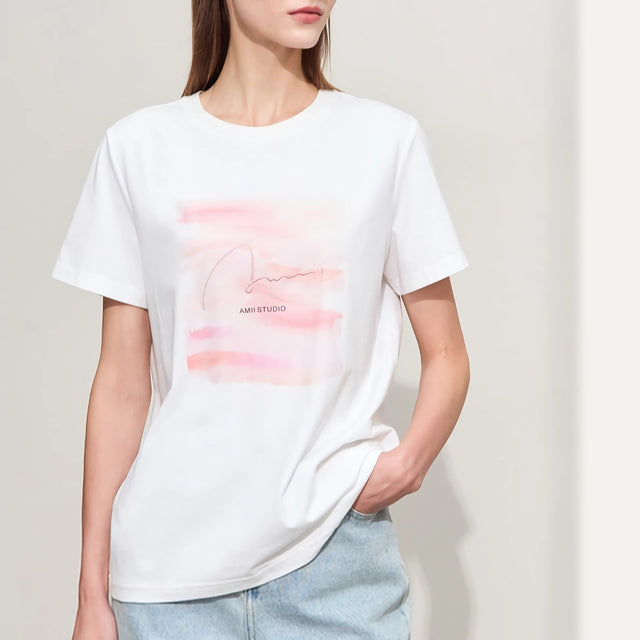 Lässiges besticktes T-Shirt für Damen mit Rundhalsausschnitt - Kunstdruck - S / Weiß ist auf Lager und wird versandt, sobald es wieder verfügbar ist
