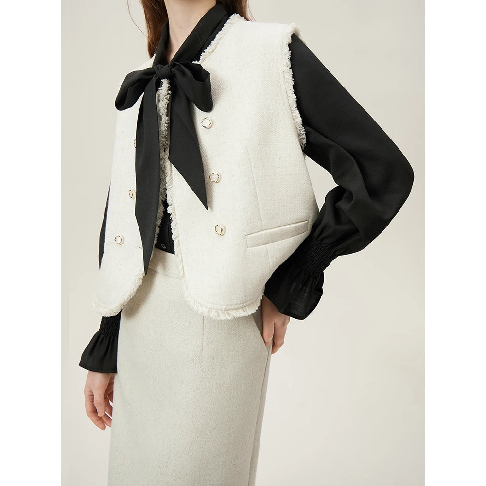 Beginnen Sie die Saison mit einem anspruchsvollen Look, der Eleganz und Professionalität vereint. Unsere elegante zweireihige Damenweste in Aprikose und Weiß ist das perfekte Ensemble für die moderne Bürodame.
