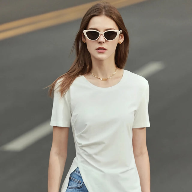 Mit unserem minimalistischen, asymmetrischen Kurzarm-T-Shirt mit Rundhalsausschnitt und Asymmetrischem Saum können Sie mühelosen Stil beweisen. Dieses T-Shirt ist so konzipiert, dass es eine perfekte Mischung aus Komfort und schickem Stil bietet und somit ein Muss für Ihre Garderobe ist. Egal, ob Sie sich für einen lässigen Tag schick machen oder etwas Bequemes und dennoch Stilvolles für zu Hause suchen, dieses T-Shirt ist die ideale Wahl.WICHTIGSTE EIGENSCHAFTEN