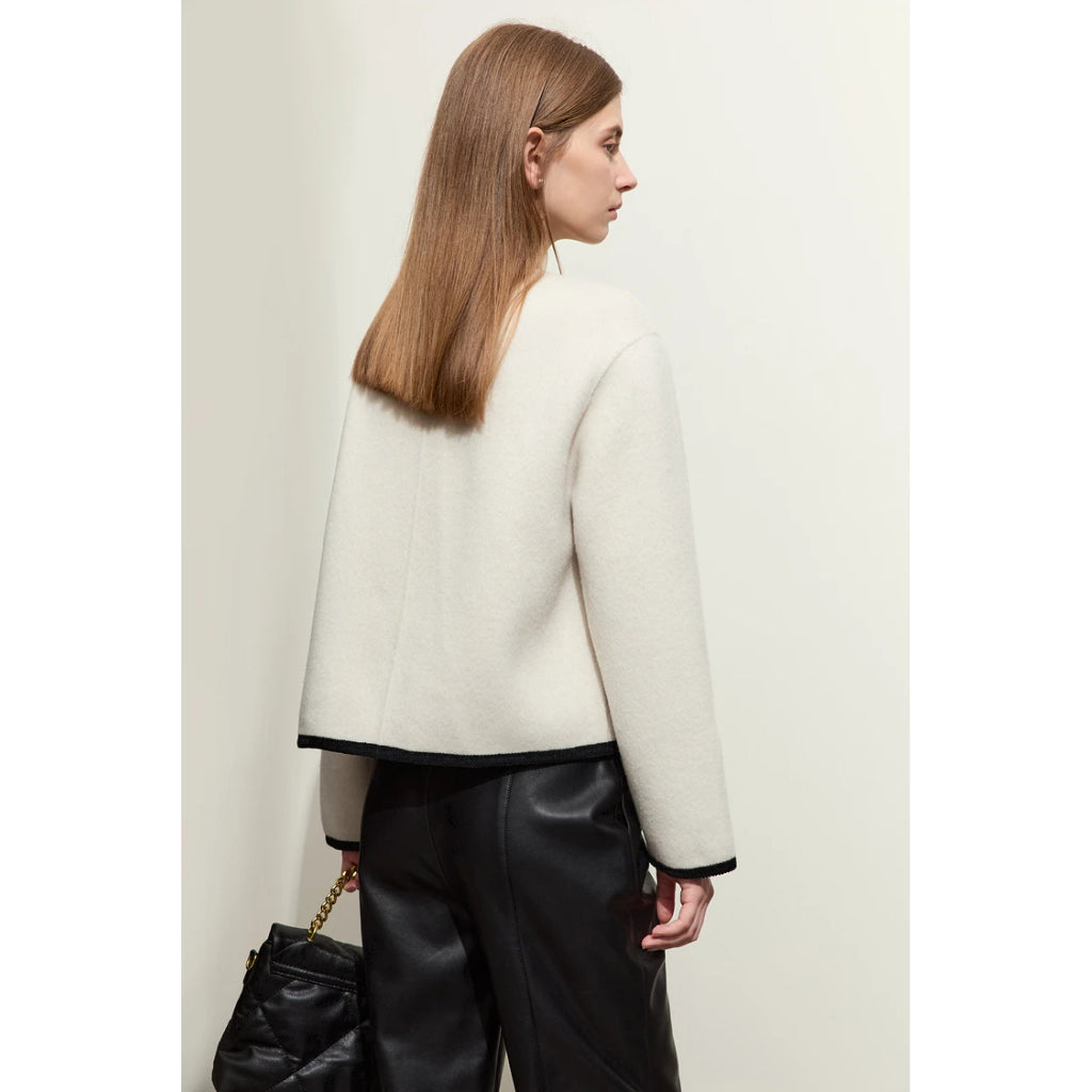 Entdecken Sie die perfekte Mischung aus Stil und Wärme mit unserem trendigen Wollmantel mit Rundhalsausschnitt für Damen. Dieser Mantel wurde für die moderne Bürodame entworfen und verleiht jedem Herbstoutfit eine raffinierte Note. Dieser Mantel besteht aus einer luxuriösen Mischung aus Schafwolle, Kaninchenhaar und Maulbeerseide und bietet unvergleichlichen Komfort und eine zeitlose Ästhetik. Die Kontrastnähte und das doppelseitige Design verleihen ein einzigartiges Flair und sorgen dafür, dass Sie in jeder Menge auffallen.