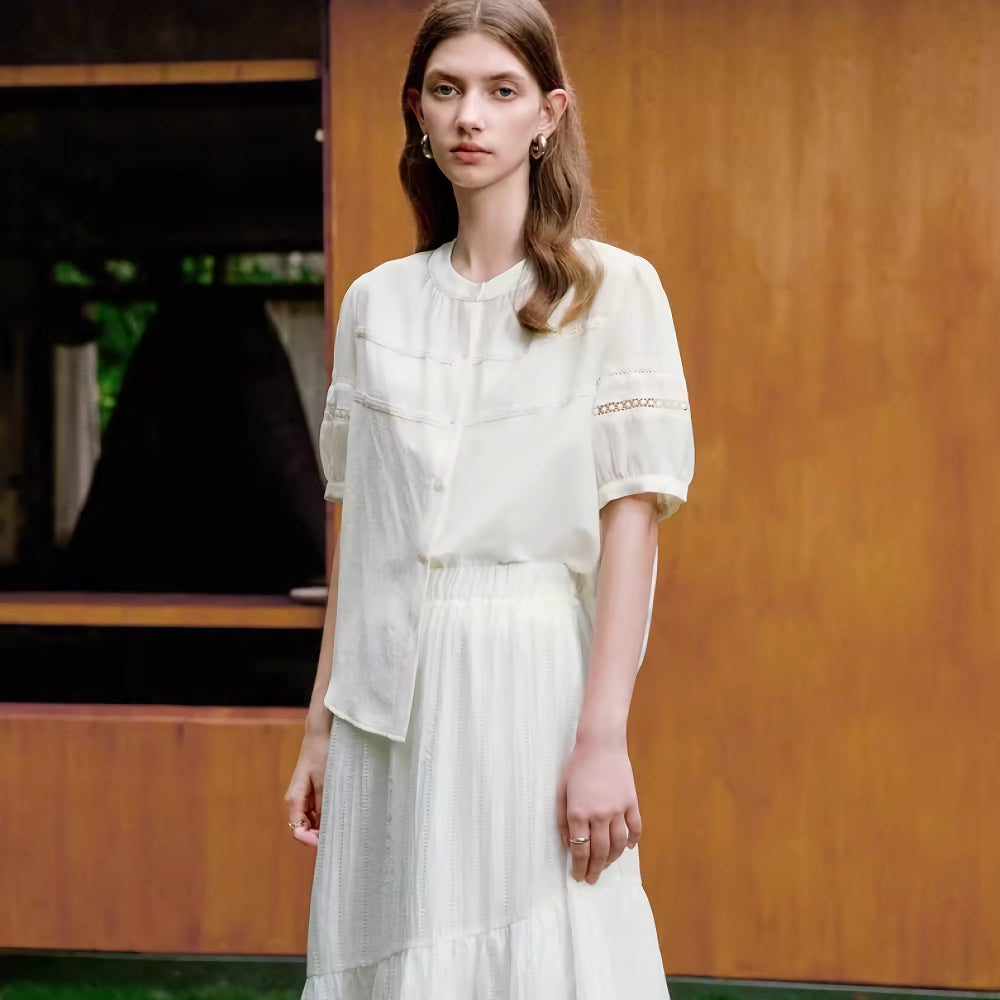 Beginnen Sie den Herbst mit Stil und Anmut mit dieser eleganten Bluse, die sich perfekt für jede Freizeit- oder Büroumgebung eignet. Diese Bluse wurde für die moderne Frau entworfen und verfügt über einen zeitlosen Rundhalsausschnitt und zarte Spitzendetails, die Ihrer Garderobe eine raffinierte Note verleihen. Die kurzen Puffärmel verleihen einen Hauch von Weiblichkeit und machen sie zur idealen Wahl für Arbeit und Freizeit.