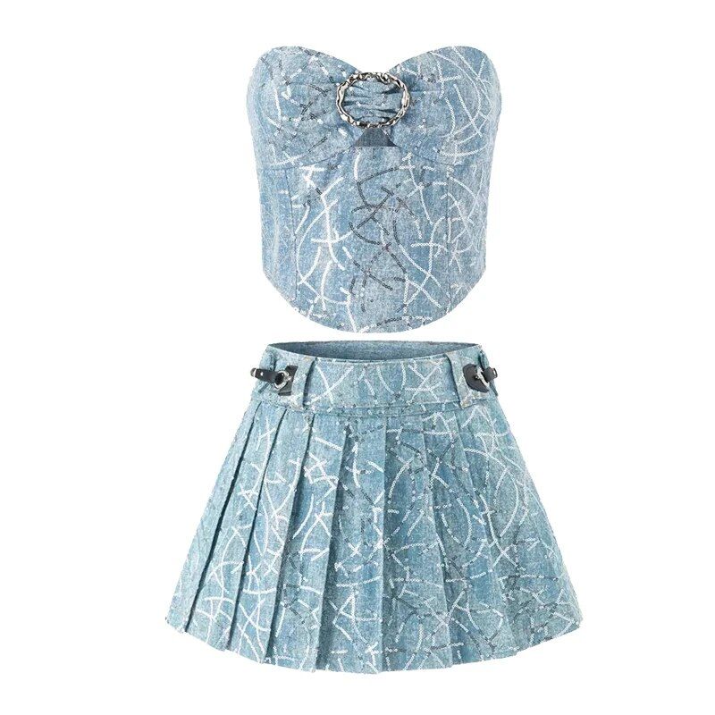 Dieses Set ist nicht nur ein Modestück, es ist eine Reise in die Vergangenheit. Die Kombination aus schulterfreiem Korsett-Oberteil und Mini-Faltenrock vereint die besten Elemente der 90er-Jahre-Mode und verleiht Ihnen einen einzigartigen und unvergesslichen Look. Die Pailletten verleihen einen Hauch von Glamour, der die Blicke auf sich zieht und Gespräche anregt.Vorteile, denen Sie nicht widerstehen können