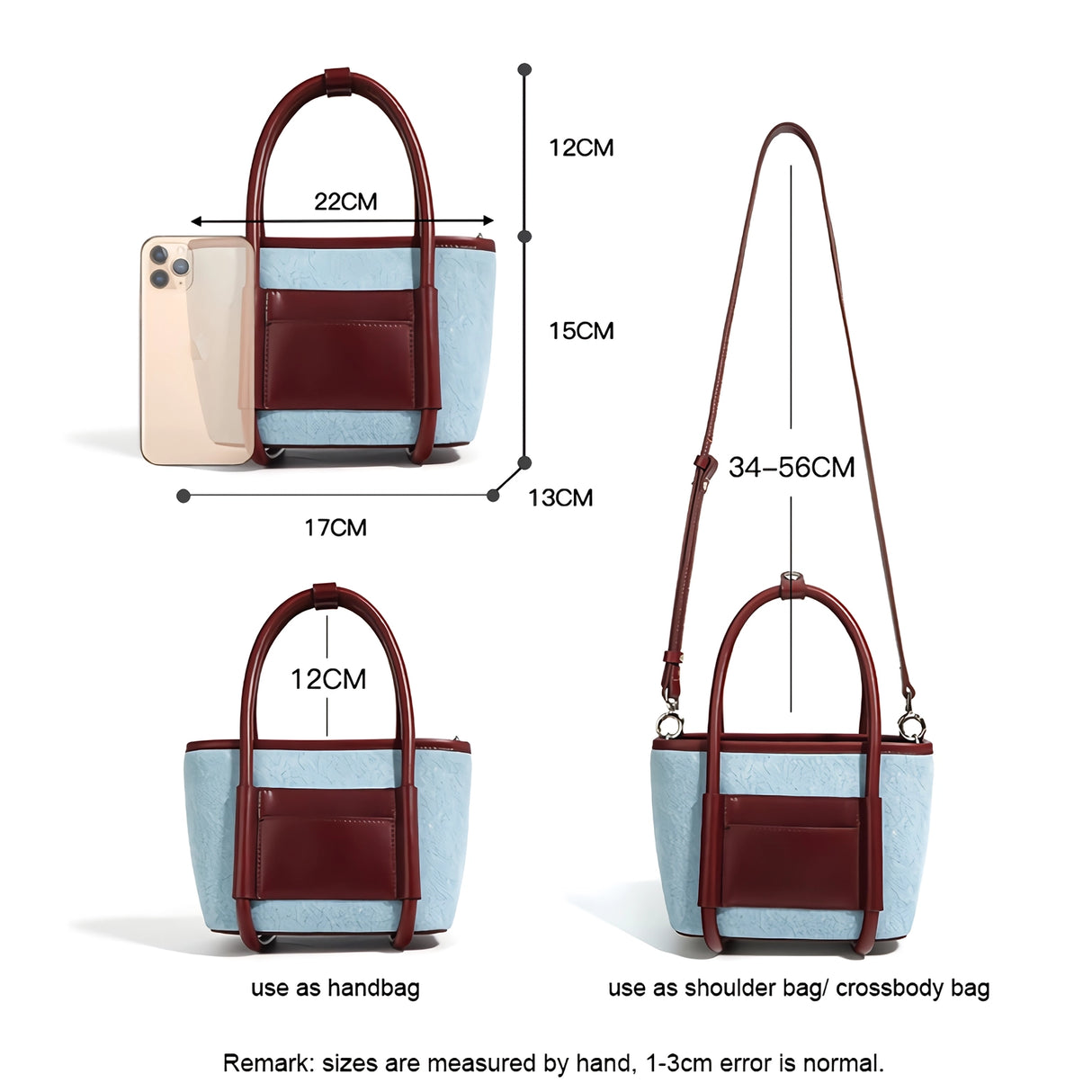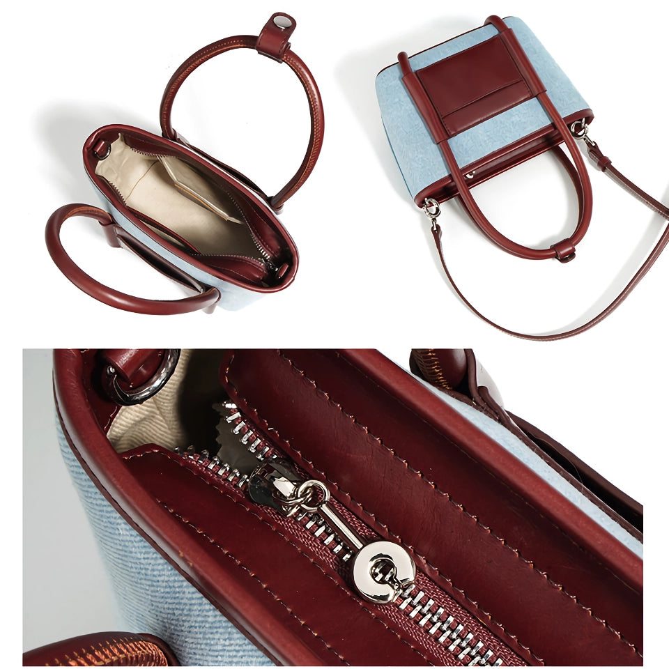 Diese Mini-Einkaufstasche wurde mit Liebe zum Detail entworfen und bietet sowohl Stil als auch Substanz. Der Denim-Stoff strahlt einen entspannten Charme aus, während die Akzente aus echtem Leder einen Hauch von Raffinesse verleihen. Der verstellbare Schultergurt mit einer Höhe von 34 cm bis 56 cm ermöglicht es Ihnen, die Passform für ultimativen Komfort anzupassen, egal ob Sie sie als Umhängetasche oder Schultertasche tragen. Das weiche Patchwork-Design, ergänzt durch die satten Farben Denimblau und Weinrot, macht diese Handtasche zu einem echten Statement-Stück.