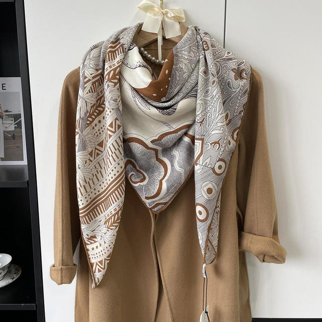 Was diesen Schal wirklich auszeichnet, ist sein luxuriöses Material und sein einzigartiges Design. Die Kombination aus Seide und Kaschmir sorgt nicht nur für ein luxuriöses Gefühl auf der Haut, sondern auch für Langlebigkeit. Der aufwendige Aufdruck verleiht Ihrem Outfit Persönlichkeit und lässt Sie aus der Menge hervorstechen. Dieser Schal ist mehr als nur ein Accessoire; er ist Ausdruck Ihres persönlichen Stils. Dank seiner Multifunktionalität können Sie ihn auf verschiedene Arten stylen, was ihn zu einer vielseitigen Ergänzung für jede Garderobe macht.