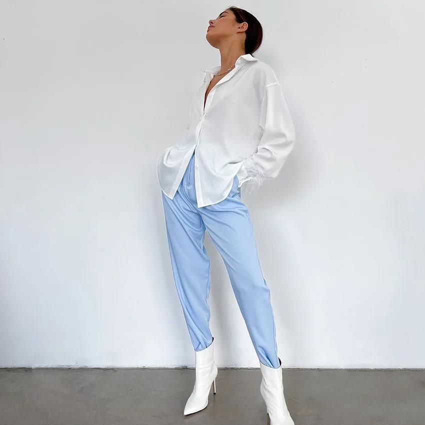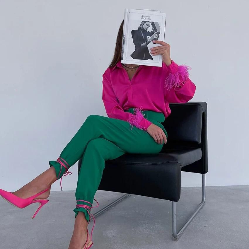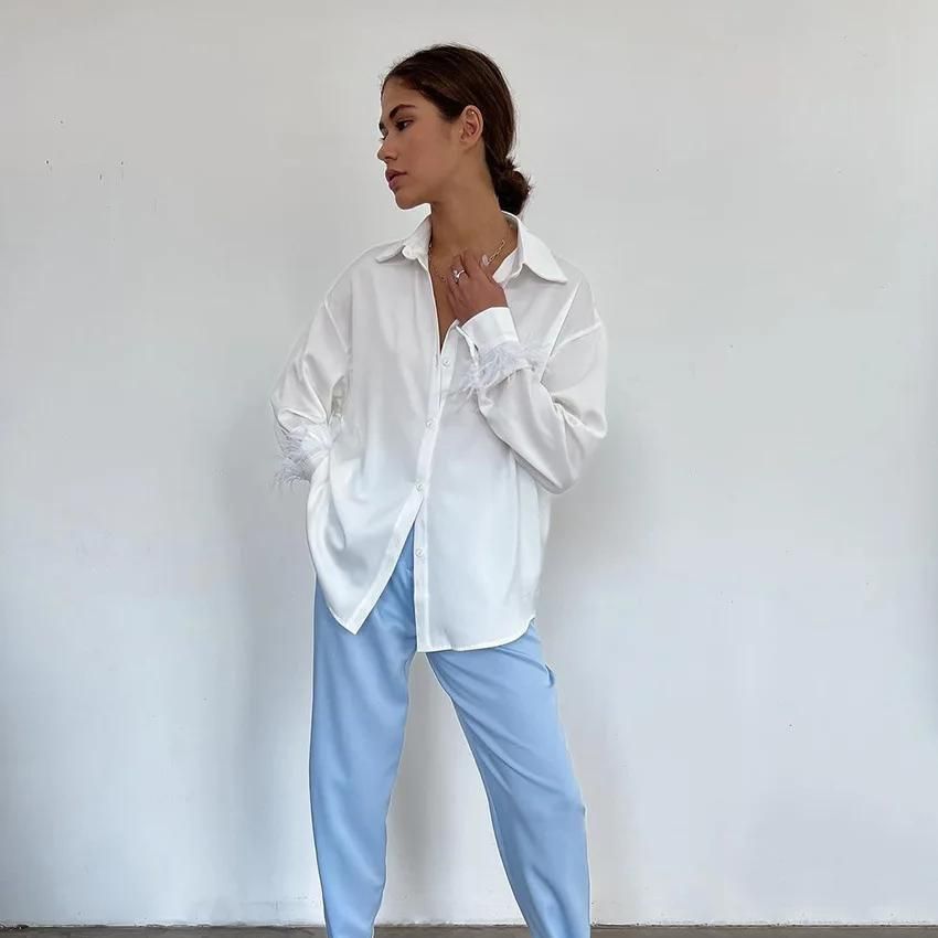 Unsere Bluse ist nicht nur ein Kleidungsstück, sie ist ein Statement. Die Federverzierung verleiht ihr einen Hauch von Einzigartigkeit und hebt Sie von der Masse ab. Die Mischung aus Freizeit- und Bürostil macht sie für verschiedene Anlässe geeignet, während der hochwertige Satinstoff dafür sorgt, dass Sie gut aussehen und sich gut fühlen. Warten Sie nicht! Fügen Sie dieses exquisite Stück noch heute Ihrer Sammlung hinzu und erleben Sie Eleganz wie nie zuvor. Gehen Sie mit unserer eleganten Bluse mit Federmanschetten stilvoll aus.