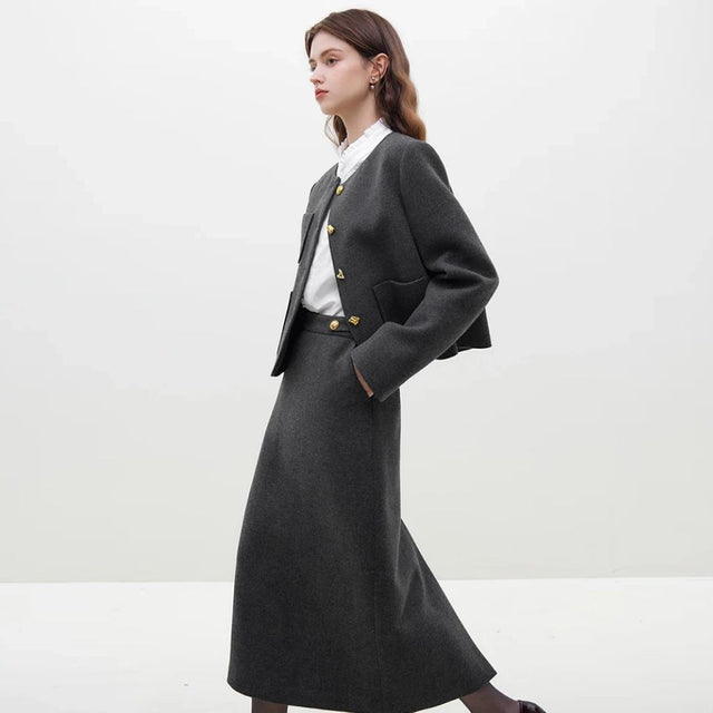 Wollmantel + Rock-Set im koreanischen Stil für stilvolle Frauen