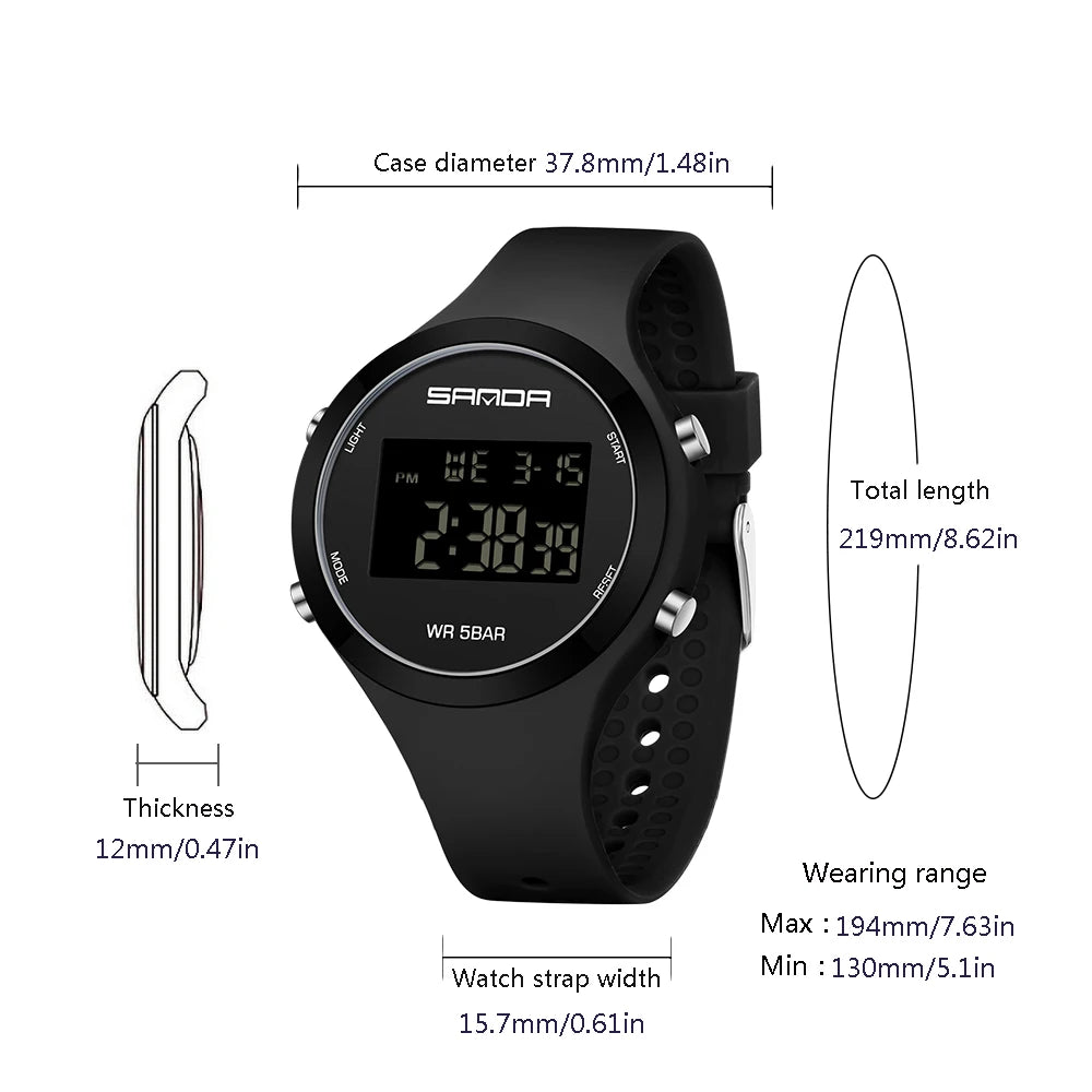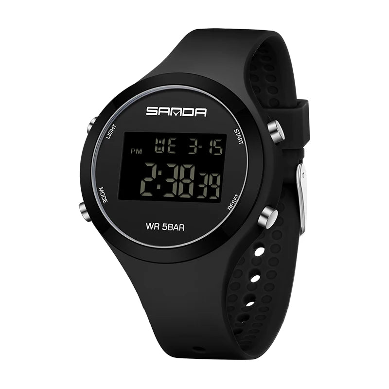 Discover the perfect blend of fashion and function with our Waterproof Digital Sports Watch, designed for women, teenagers, and kids. Whether you're looking for a trendy accessory or a durable, reliable timepiece, this watch has it all. Its sleek, modern design pairs perfectly with any casual outfit, while offering essential features for an active lifestyle. Lightweight and comfortable, it’s ideal for daily wear—whether you're at school, work, or heading out for a run. With its water resistance up to 5Bar, this watch is ready to join you for swimming, sports, or any weather condition.