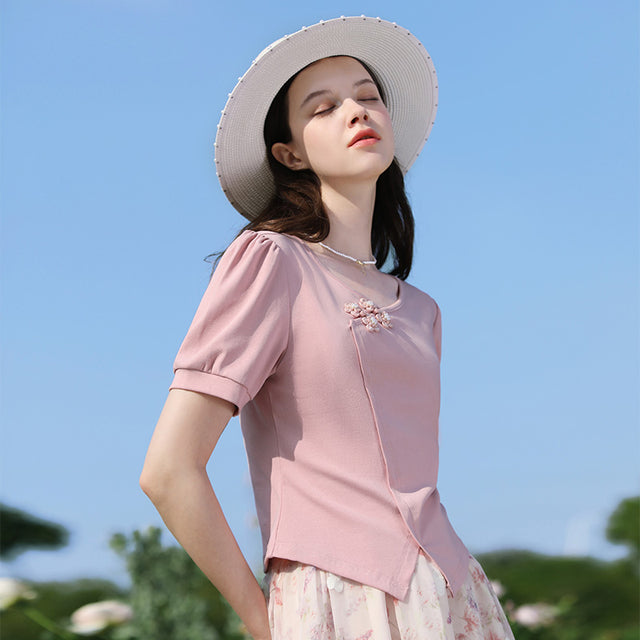 Elegant Chinese Style V-Neck Puff Sleeve T-Shirt