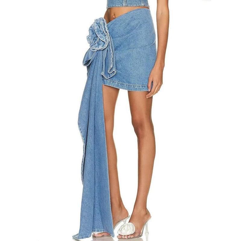 Chic High Waist Blue Denim Skirt with 3D Rose Detail