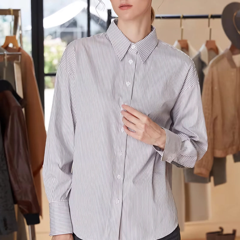 Step into the new season with style and confidence wearing our Combed Cotton Long Sleeve Striped Shirt. Designed for the modern woman who appreciates the perfect blend of comfort and elegance, this blouse is a must-have addition to your wardrobe. Ideal for both casual outings and semi-formal gatherings, this shirt promises to elevate your style effortlessly.