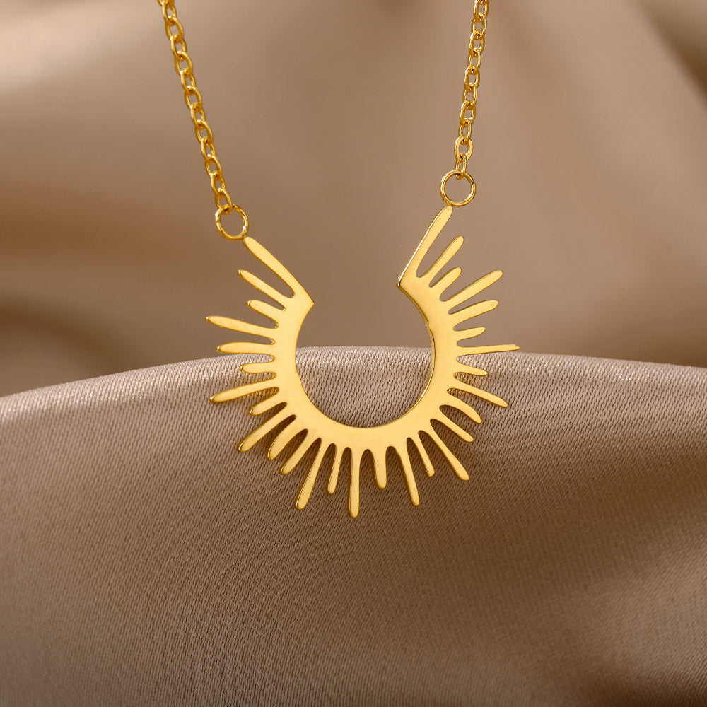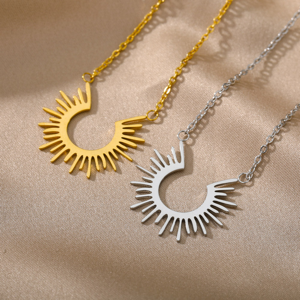 Discover the perfect blend of vintage charm and contemporary style with our Minimalist Stainless Steel Half Circle Sun Pendant Necklace. Crafted to perfection, this necklace captures the essence of minimalism while making a bold statement. Its unique geometric design, featuring an irregular half-circle sun pendant, adds a touch of mystique and sophistication to any outfit. Whether you're dressing up for a special occasion or adding flair to your everyday look, this piece is your go-to accessory.