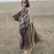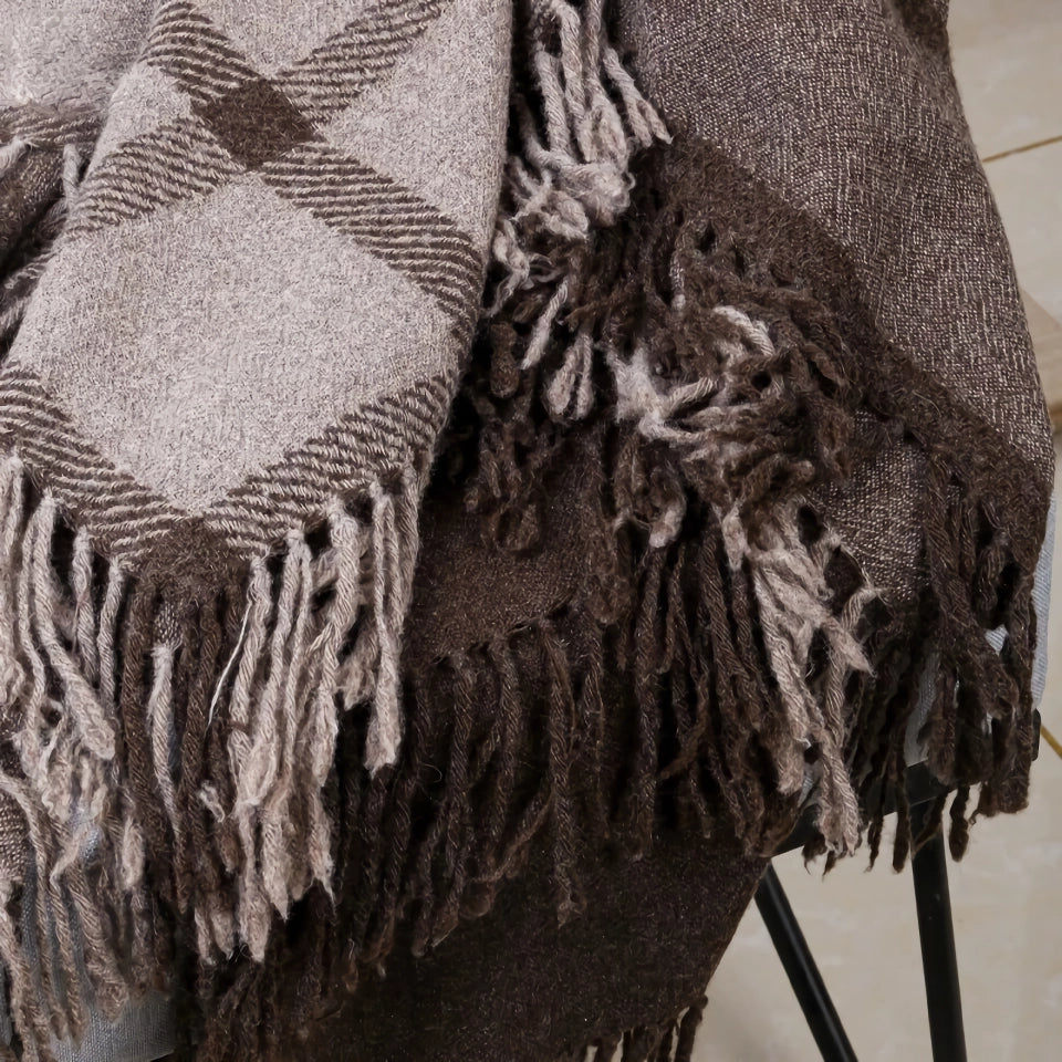 This scarf is more than just an accessory; it's a statement piece that combines fashion with function. The geometric plaid design in soothing coffee beige tones brings a sophisticated look that effortlessly complements any outfit. Measuring over 69 inches in length, it provides ample coverage, allowing you to wear it as a shawl, blanket, or traditional scarf. The handmade tassels add a touch of artisanal charm, making each piece unique and special.