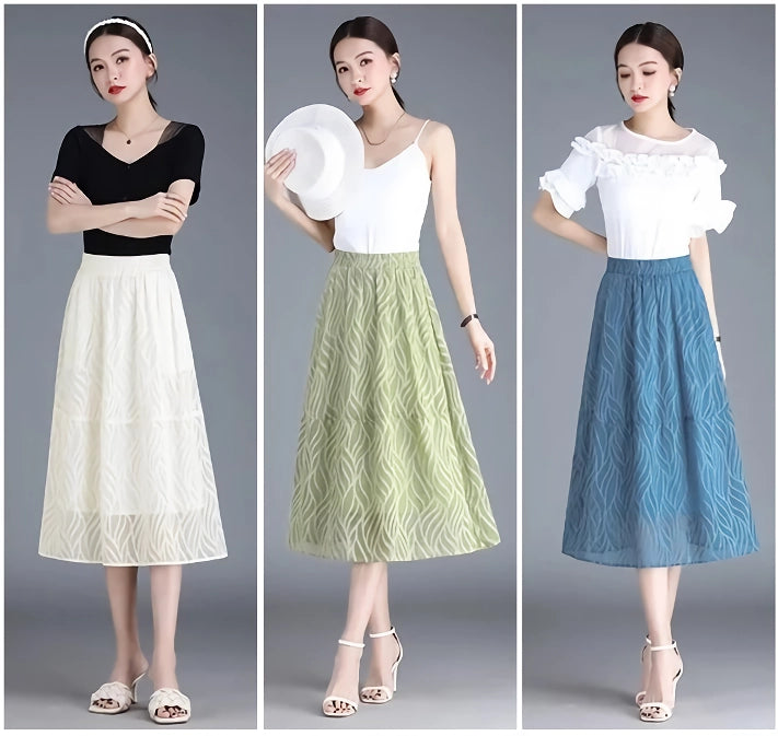 Experience the perfect blend of comfort and chic style. Click 'Add to Cart' and redefine your style statement with our Elegant Mid-Calf Chiffon Skirt!