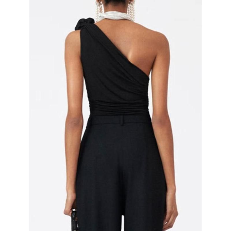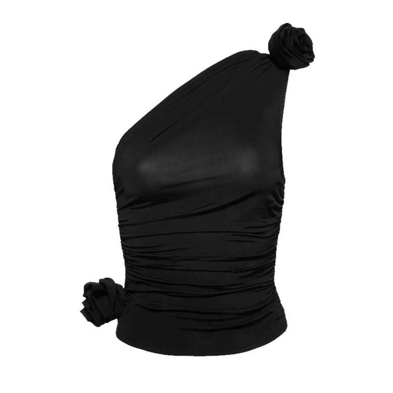 What sets this tank top apart is its attention to detail. The three-dimensional rose decoration is not just an adornment; it's a statement of style and individuality. The diagonal shoulder design is both bold and flattering, ensuring you stand out in the best way possible. Its high street fashion appeal caters to those with a taste for exclusive and trendy designs.