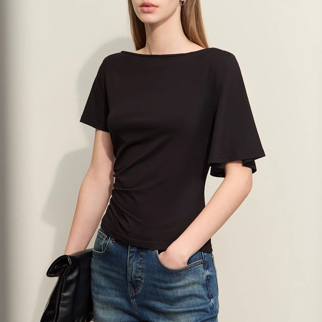 The standout feature of this T-shirt is its unique asymmetric slash neck, which adds a modern twist to a classic silhouette. The shirring detail further enhances its elegance, making it a distinctive piece that sets you apart from the crowd. Additionally, the blend of cotton, modal, and spandex ensures that the top is not only stylish but also incredibly comfortable and breathable.Benefits