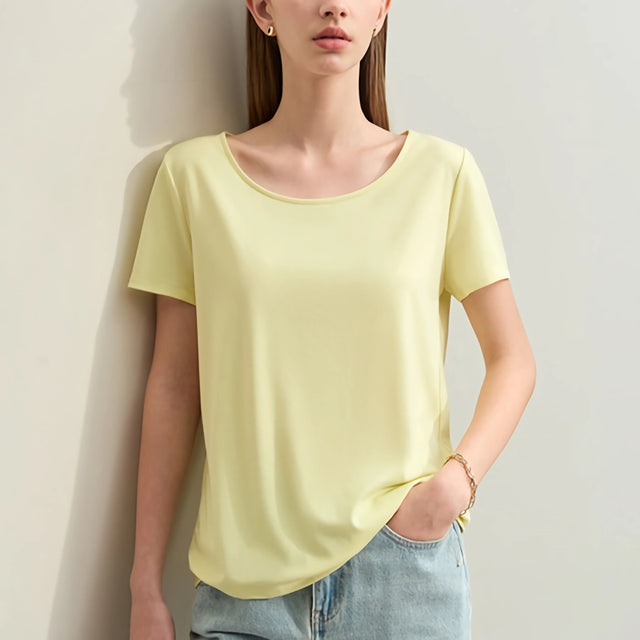 Whether you're heading to the office, a casual outing, or a weekend brunch, this t-shirt is your go-to choice. Its minimalist design makes it easy to pair with jeans, skirts, or trousers, allowing you to create various looks with ease. The solid color and clean lines offer a timeless appeal, making it a staple piece in any wardrobe.