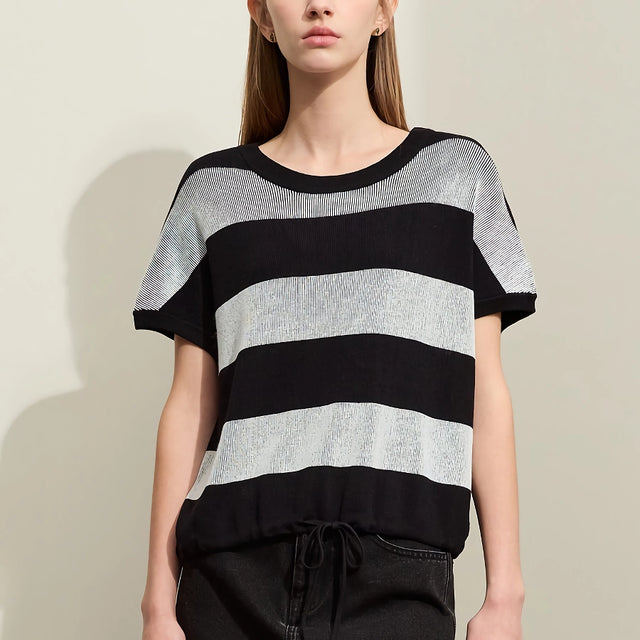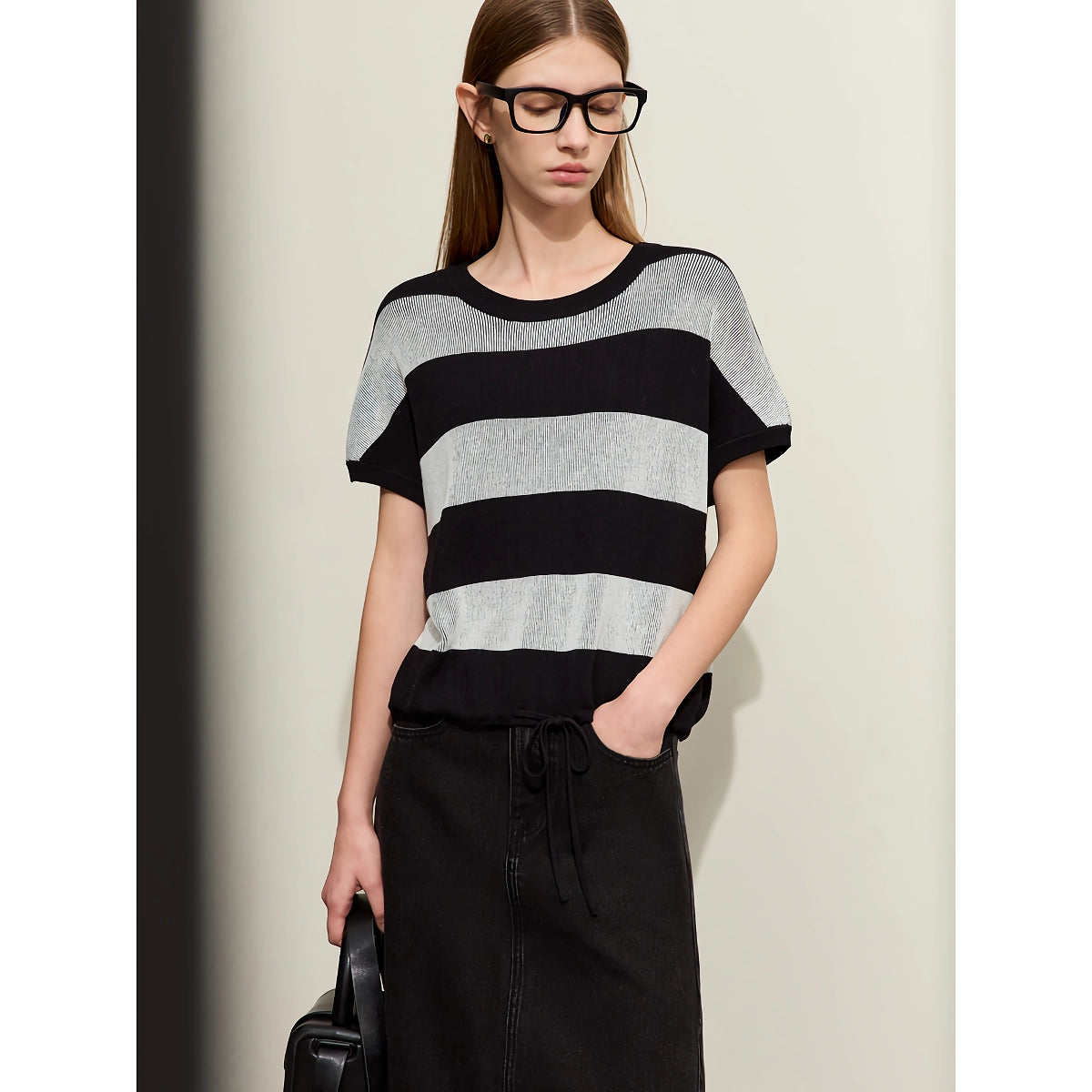 This versatile jumper features a loose fit and a striking wide striped pattern, making it a standout piece in any wardrobe. The crewneck design and raglan sleeves add a touch of classic style, while the stretchy drawstring short sleeves provide a customizable fit for maximum comfort.- Clothing Length: Regular